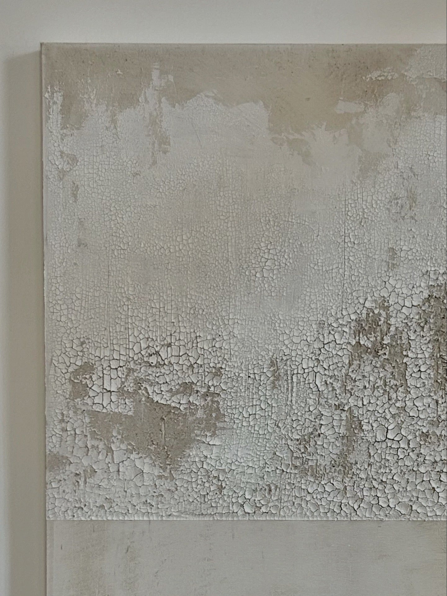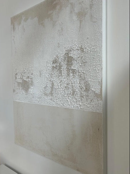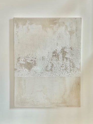 Build in soft, neutral tones, the surface reveals layers of texture cracked, shifted and settled. Rooted in a wabi-sabi sensibility, the work invites slow looking.